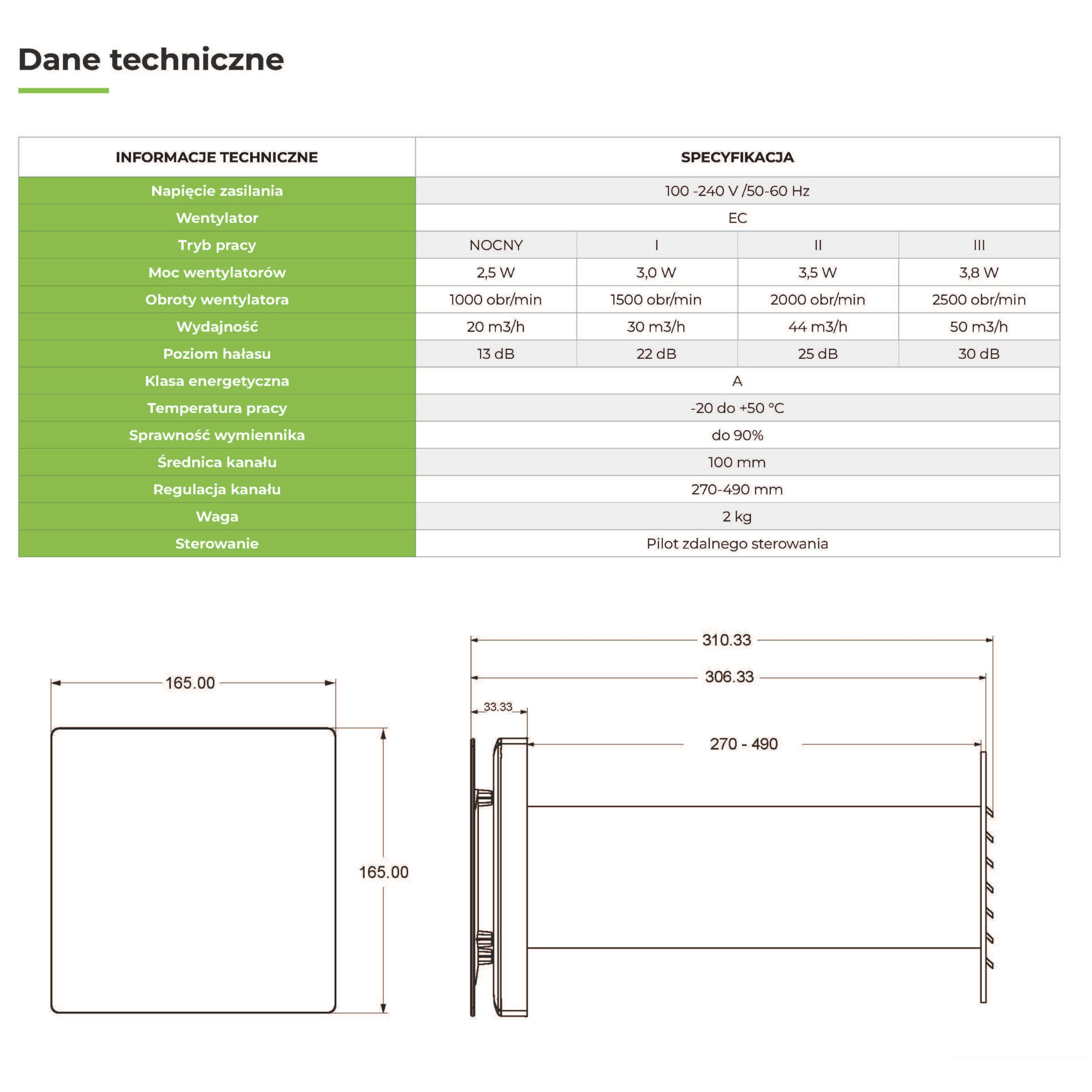 - Praca w 4 trybach (Tryb nawiewu / Tryb wywiewu / Tryb cykliczny (nawiew 65s - wywiew 65s / Tryb nocny (cichy)