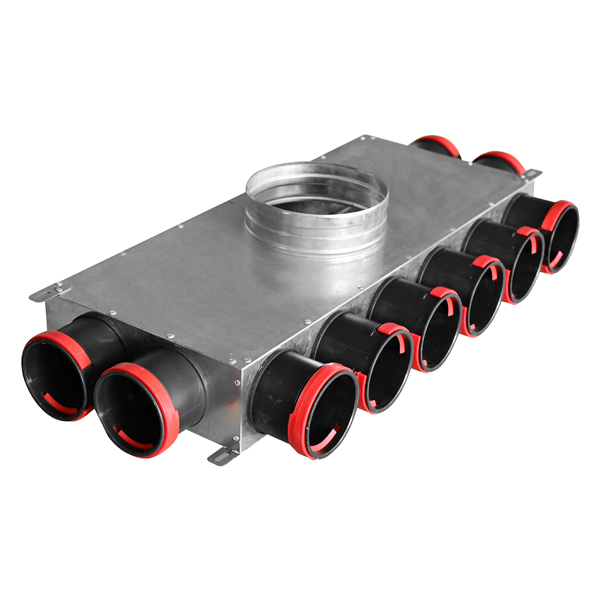 Korpus rozdzielacza wykonany jest z blachy ocynkowanej. Dodatkowo, niewielkie wymiary pozwalają na jego wygodne umieszczenie w stropie lub dyskretne ukrycie w ścianie, co ułatwia estetyczny montaż i oszczędność przestrzeni.