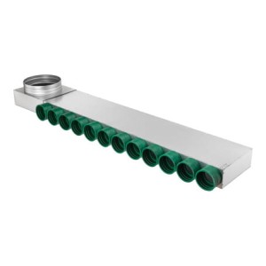Korpus rozdzielacza wykonany jest z blachy ocynkowanej. Dodatkowo, niewielkie wymiary pozwalają na jego wygodne umieszczenie w stropie lub dyskretne ukrycie w ścianie, co ułatwia estetyczny montaż i oszczędność przestrzeni.